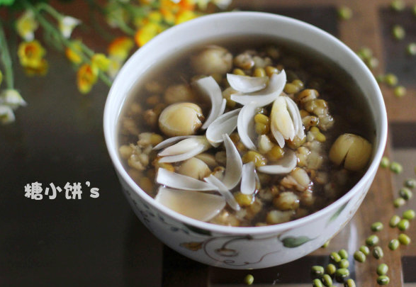 1 cup of green beans, 3/4 cups of lotus seeds, 1 lily, 8 cups of water, 10 grams of rock sugar